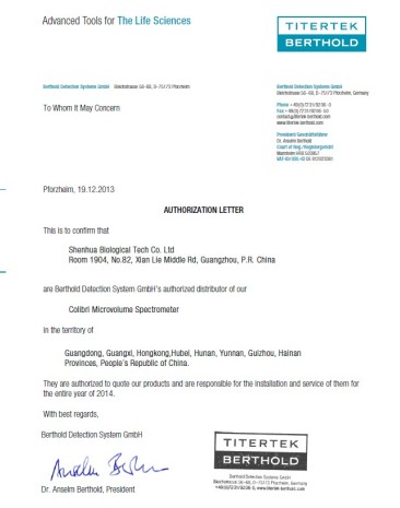 德國伯赫Titertek Berthold是一家擁有35年歷史的著名生命科學(xué)儀器制造廠商,是專注于樣品處理、自動工作站和樣品檢測的高科技公司?偛亢脱邪l(fā)生產(chǎn)基地設(shè)在美國Huntsville和德國Pforzheim。2011年德國伯赫Titertek-Berthold公司并推出一款新型超微量分光光度計-Colibri,2013年廣州市深華生物技術(shù)有限公司正式成為德國Norllu伯赫公司超微量分光光度計南方區(qū)總代理。