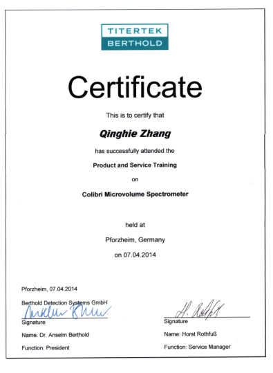 在4月份廣州市深華生物技術有限公司在總經理張清杰的帶領下一行三人參加了第24屆Analytica 2014德國慕尼黑實驗室分析生化儀器展。在德國伯赫公司的工廠接受了產品培訓,(Titertek Berthold是一家擁有35年歷史的著名生命科學儀器制造廠商,是專注于樣品處理、自動工作站和樣品檢測的高科技公司,總部和研發(fā)生產基地設在美國Huntsville和德國Pforzheim),廣州深華公司也成功獲得德國伯赫Titertek Berthold產品售后培訓資格證書。
