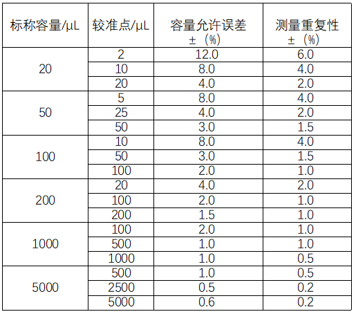 2.當調(diào)整后測得的實際容量值與標示容量值符合表1要求時,將移液器容量調(diào)整至中間量程繼續(xù)測量。中間量程符合要求時,再調(diào)整至最大量程繼續(xù)測量;